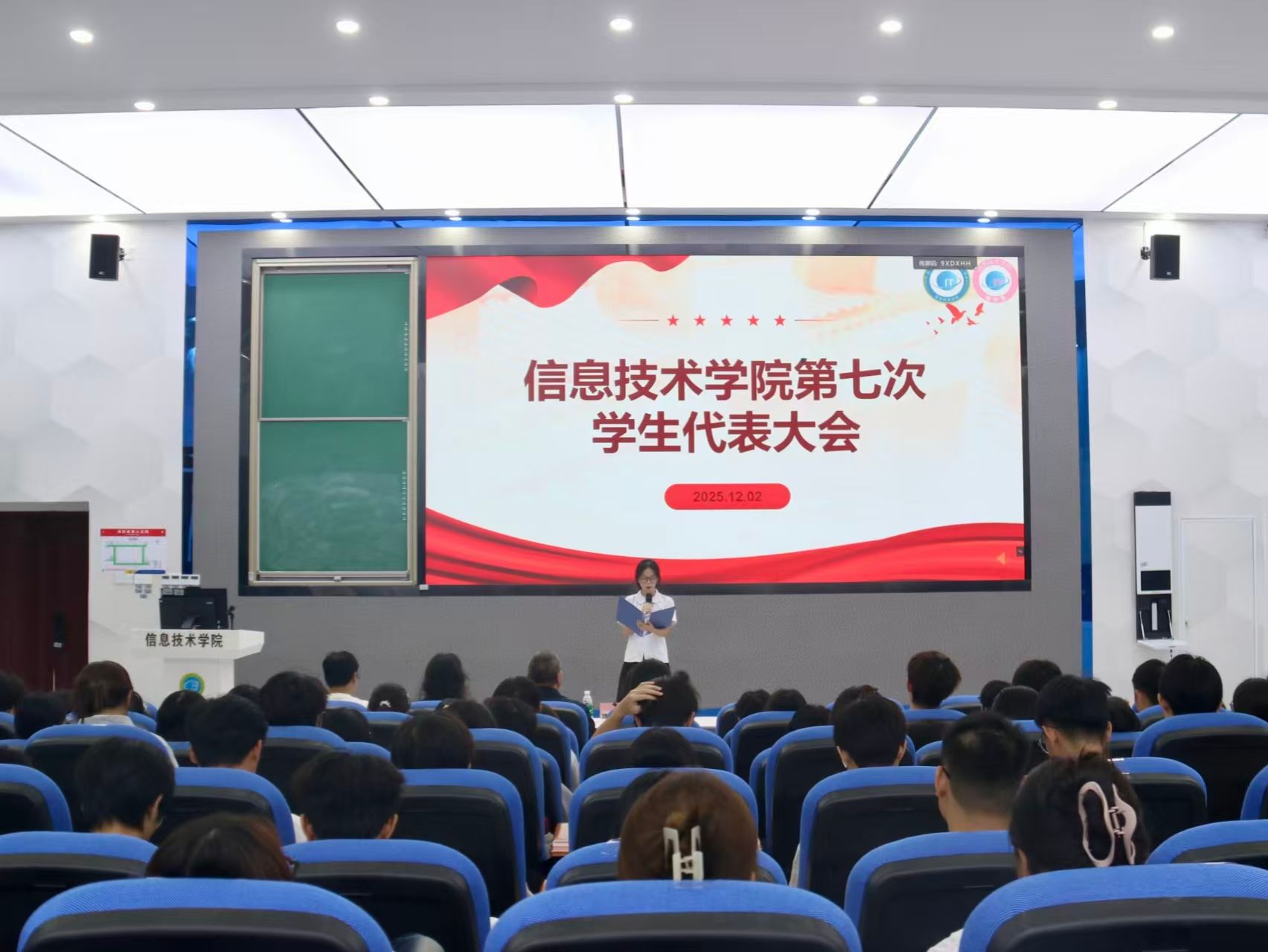 2025年12月2日,信息技术学院第七次学生代表大会在4-215教室顺利召开。本次大会由邱叶主持,信息技术学院党总支副书记黄守官、学生党支部书记代晓明老师、团学指导老师兼23级辅导员蔡守正老师、团学指导老师兼24级辅导员吴佳华老师出席会议,以及全体学生代表参会。