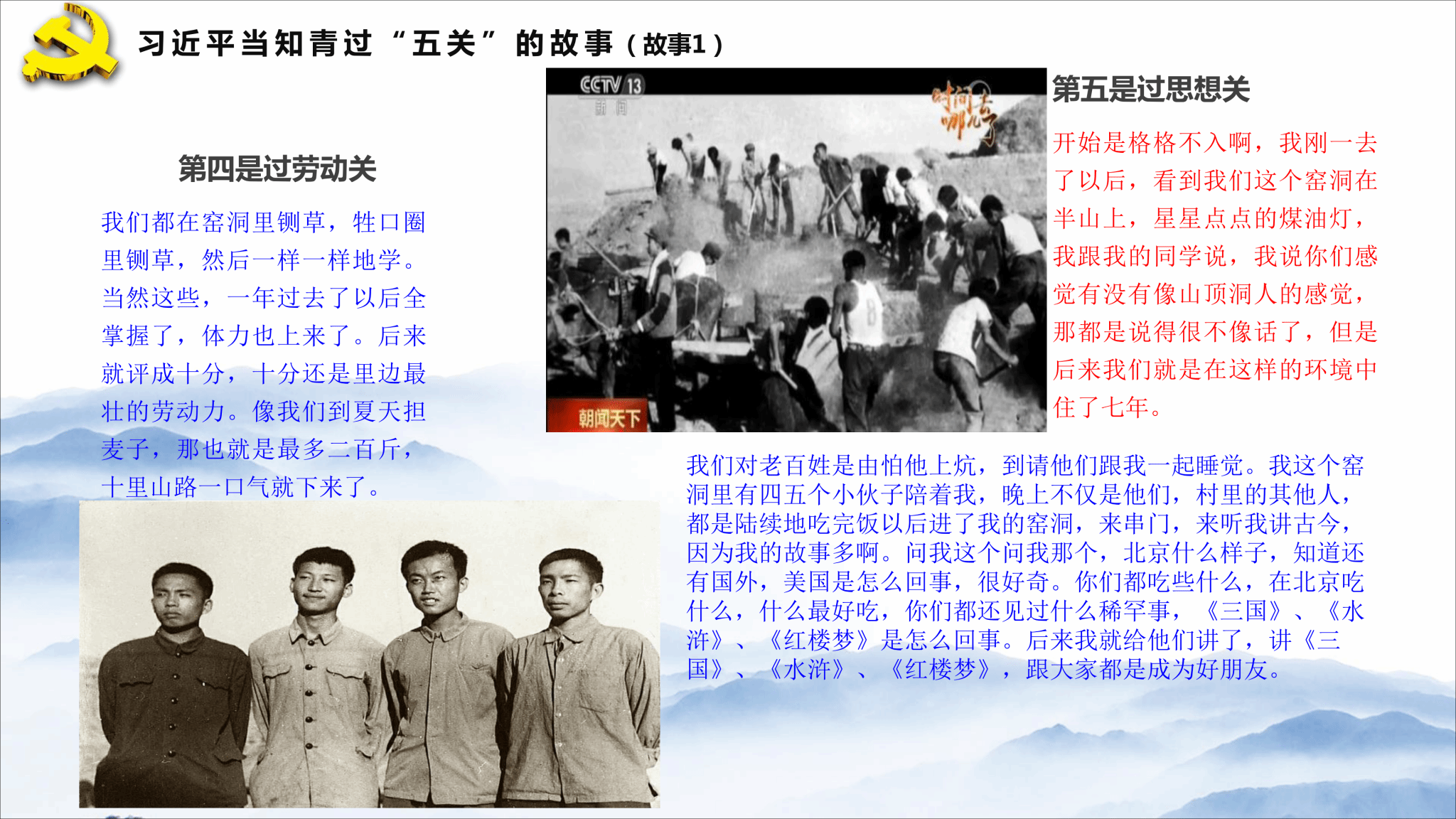 符胜带领全体新生重温了那段历史,从“知识青年上山下乡、文化大革命、习近平当知青的背景、习近平当知青的10个故事、习近平回村看望老乡和结束语”等六个方面,再现了习近平总书记当知青时期的艰苦生活和成长历程,诠释了习近平总书记七年知青岁月的点点滴滴。