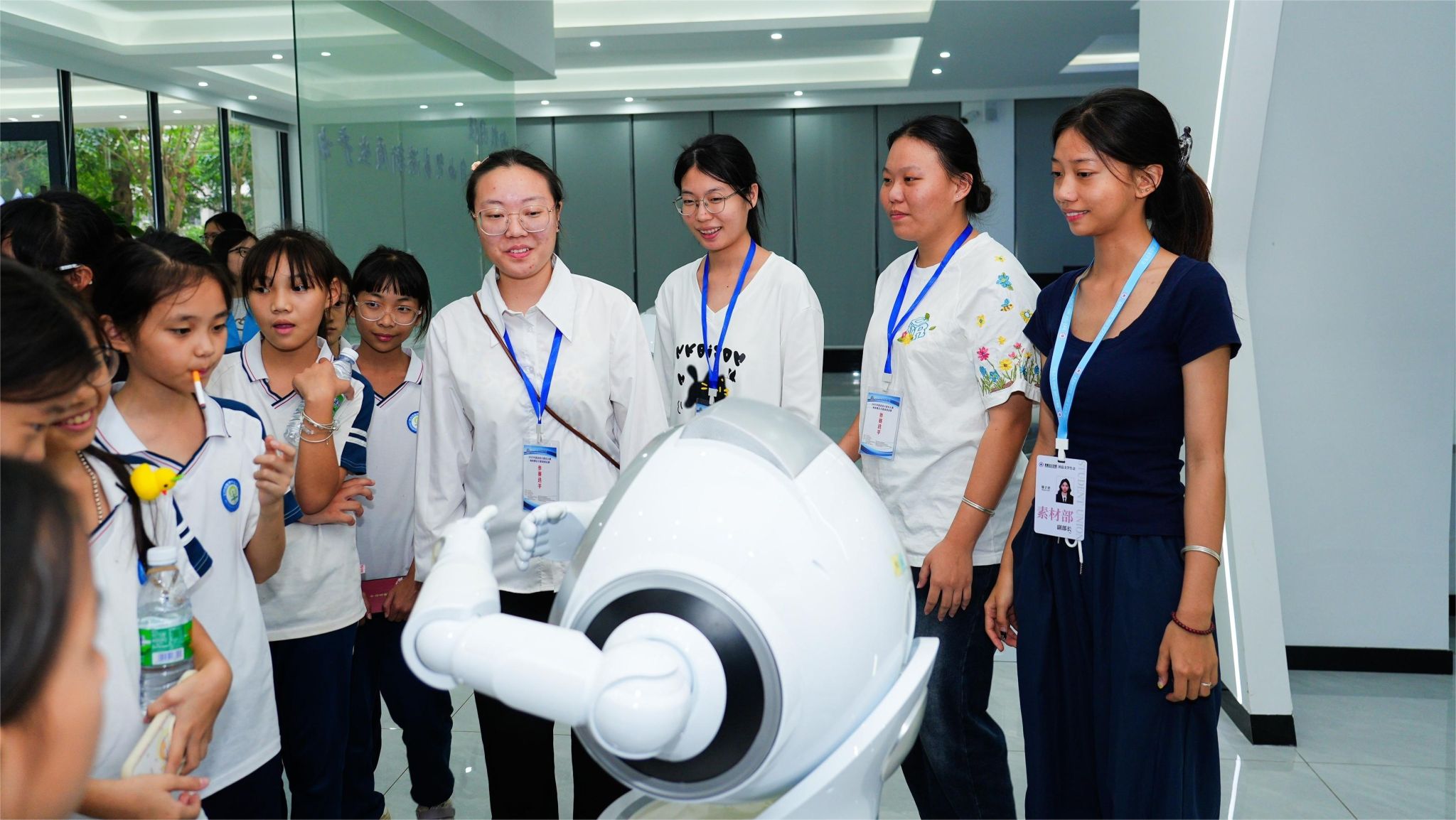 在职业体验中心专业教师的引导下,同学们参观了人工智能教育海南省职业体验中心的ICT产教融合基地。基地内设有前厅展示区、人工智能职业体验区、数据采集和数据标注区、软件测试区等多个功能区域,在前厅展示区,虚拟数字人和智能服务机器人引起了孩子们的浓厚兴趣。他们一边认真聆听讲解,一边动手参与互动体验,对人工智能技术应用的有了更为直观的认知。