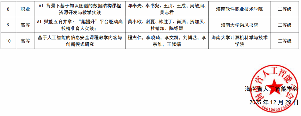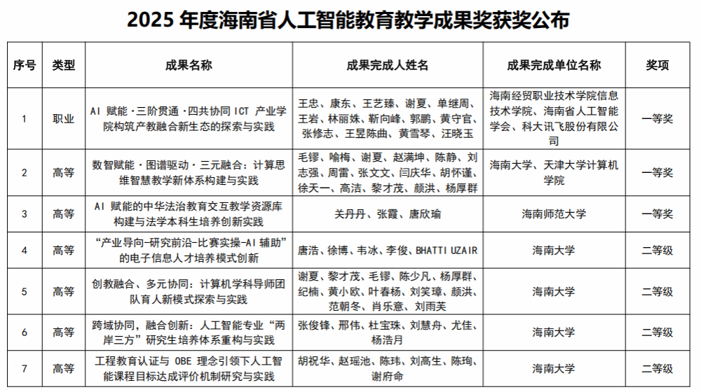 近日,2025年度海南省人工智能教育教学成果奖获奖名单正式公布。由我院联合海南省人工智能学会、科大讯飞股份有限公司共同申报的成果《AI赋能·三阶贯通·四共协同:ICT产业学院构筑产教融合新生态的探索与实践》,在全省众多优秀项目中脱颖而出,荣获一等奖。该奖项的获得,标志着我院在人工智能与职业教育深度融合、创新产教融合模式方面取得了重要突破,体现了学院在推动教育教学改革、服务区域产业发展中的示范引领作用。
