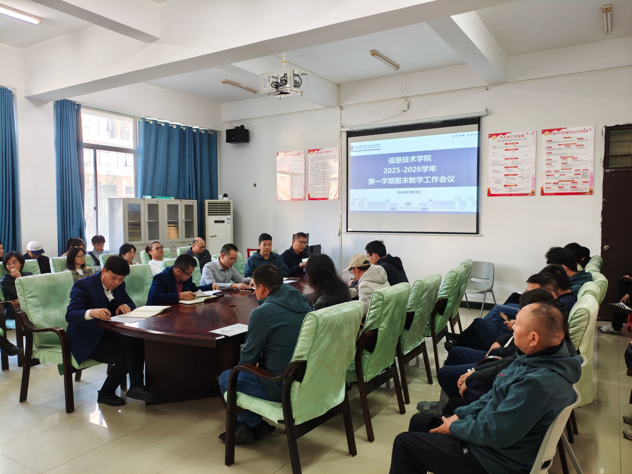 2026年1月12日,信息技术学院在4-213会议室召开2025-2026学年第一学期期末工作会议。会议由学院党总支书记符胜主持,学院党政领导班子成员及全体教职工参会。