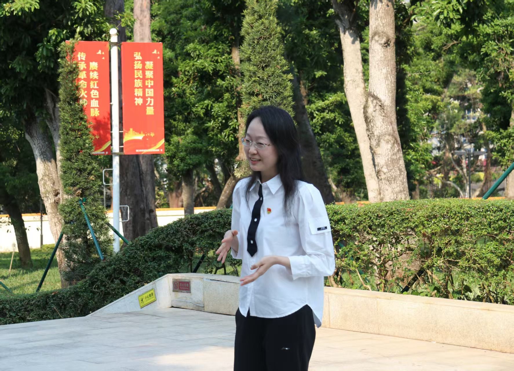 党课伊始,代晓明老师带领同学们瞻仰了如一艘乘风破浪的木帆船纪念碑,碑后方的石壁上,朱德元帅亲笔题写的“渡海英雄永垂不朽”八个大字熠熠生辉。她深情讲述了76年前解放军以木船打败军舰、跨越琼州海峡解放海南的战争奇迹,让在场同学深受震撼,心中满是对革命先烈的无限敬仰。